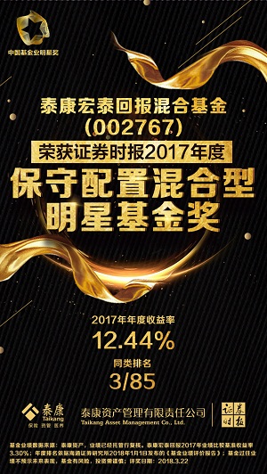 3月22日,由证券时报主办的第十三届中国基金业“明星基金奖”榜单揭晓,继去年摘得“2016年度明星基金公司成长奖”和“2016年度平衡混合型明星基金奖”两项桂冠之后,泰康资产公募基金今年再度将“2017年度明星基金公司成长奖”、“2017年度保守配置混合型明星基金”两座奖杯揽入怀中。