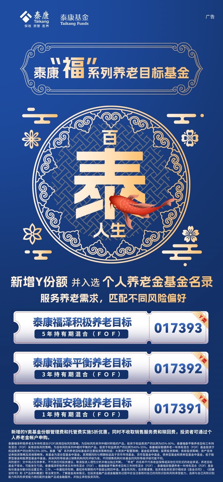泰康基金“福”系列养老目标基金:泰康福安稳健养老目标一年持有期混合型基金中基金(FOF)(Y类:017391)、泰康福泰平衡养老目标三年持有期混合型基金中基金(FOF)(Y类:017392)、泰康福泽积极养老目标五年持有期混合型发起式基金中基金(FOF)(Y类:017393)成功入围个人养老金基金名录,投资者可在招行、天天、蚂蚁等代销平台申购Y份额。